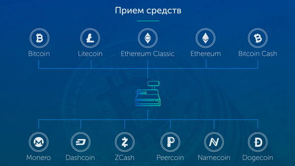 Приём средств (Dash, Bitcoin, Litecoin, Ethereum, Bitcoincash, Dogecoin, Ethereumclassic, Namecoin, Peercoin, Monero, Zcash) Из них есть 3 анонимные криптовалюты (в блокчейне не видно ID кошельков и суммы транзакции) - Monero (XMR), Dash (Dash) и Zcash (ZEC)