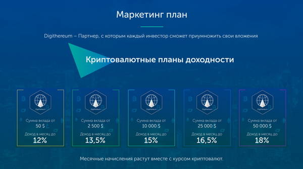 Digithereum Global - Компания по доверительному управлению криптовалютными активами Мы предоставляем вам инновационный подход к инвестициям. Компания выбрала свой курс, учитывая тенденции динамичного криптовалютного рынка, и готова покорять новые вершины.