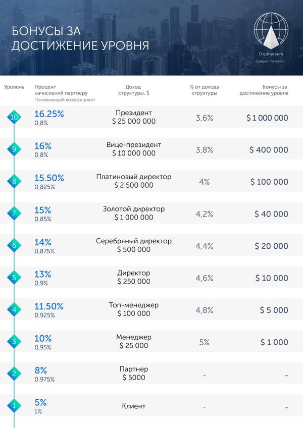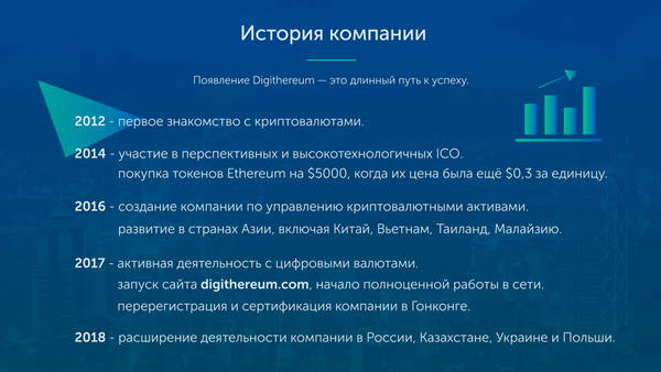 История компании Digithereum Global Появление Digithereum — это длинный путь к успеху. 10 лет назад группа молодых и энергичных, уверенных в себе и светлом будущем людей решили испытать на себе удачу мирового рынка Forex. Глубокие знания финансовой сферы и ощущение тенденций стали формулой успешной торговли. Постепенно фортуна улыбалась, сделки становились более выгодными, появлялся настоящий опыт управления капиталом.