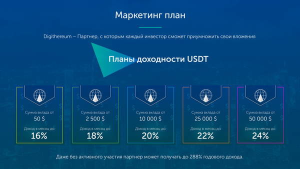 USDT (долларовые) планы доходности С Digithereum вы можете инвестировать в криптовалюты с помощью долларов, то есть ваши активы и начисления будут переводиться в традиционный фиатный эквивалент.