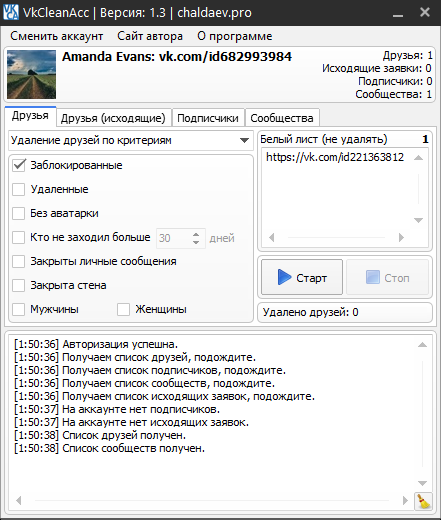 Тема: VkCleanAcc — удаление друзей и подписчиков ВК по критериям (Прочитано 2855 раз)