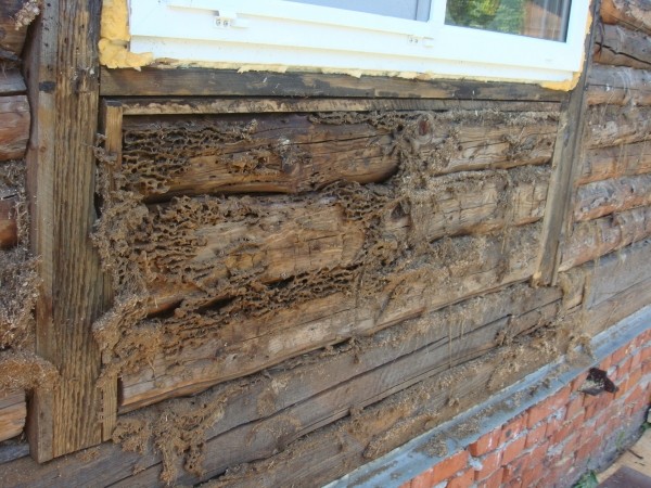 Демонтируем старую внешнюю отделку стен. Фрагменты, подточенные короедом в кружева меняем на новые из бруса.