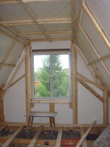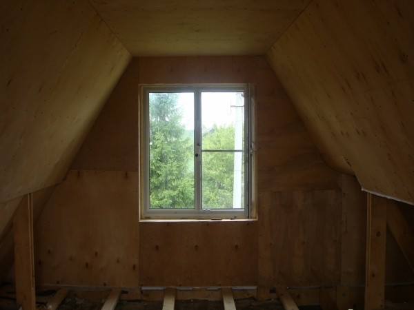 Внутрянку мансарды обшиваем фанерой. Хозяин планировал после нас отвести душу на отделке вагонкой. Я его понимаю...да и молотком помахать для мужика всегда в радость.