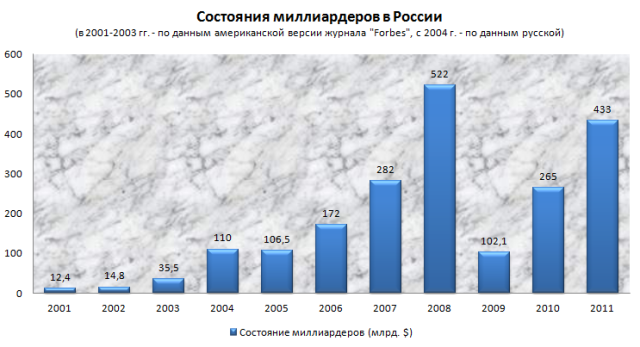 Вот рост совокупного состояния миллиардеров ("кучки людей, захапавших народные рес-сы") в РФ за время правления Путина: