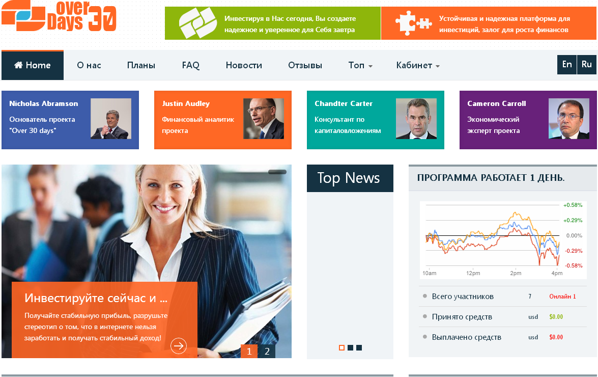 Посмотреть/ЗарегистрироватьсяОписание:Уважаемые инвесторы, рады приветствовать вас на проекте Over 30 Days. Работа нашей команды направленная на то, чтобы каждый инвестор мог получать максимальную прибыль, занимаясь торговлей криптовалютами на таких финансовых рынках, как Bitcoin и Litecoin. Наша команда состоит из профессиональных аналитиков и одаренных финансовых экспертов, которые обладают большим опытом в торговле на рынке Forex. Работая долгое время на рынках криптовалют и Forex, нами были разработаны уникальные стратегии и расширен спектр наших возможностей, которые позволяют нашим инвесторам торговать на финансовых рынках с минимальными рисками.Наши специалисты предоставляют вам возможность многократно увеличивать свой капитал ежедневно, ведь они работают для вас без выходных, семь дней в неделю и 366 дней в году. Проект Over 30 Days предлагает объединить ваши финансовые возможности, с нашими знаниями и профессионализмом, в результате вы сможете получать большую прибыль.Наши финансовые эксперты разработали девять уникальных инвестиционных планов, которые рассчитаны на широкий спектр инвесторов владеющих как небольшими стартовыми капиталами, так и инвесторов имеющих крупные капиталы. Также мы даем вам возможность зарабатывать в нашем проекте без инвестирования, для этого мы создали специальную реферальную программу, приглашайте новых инвесторов в наш проект и получайте дополнительный стабильный доход. Все что вам необходимо это пройти простую регистрацию, завести личный аккаунт на сайте, сделать вашу первую инвестицию и без особых усилий с вашей стороны вы сможете начать зарабатывать с нами.Наши специалисты круглосуточно будут управлять вашими денежными средствами, и приносить вам ежедневный, еженедельный, или ежемесячный стабильный доход. Инвестиции в нашу компанию это залог успешного и стабильного дохода на протяжении всего нашего с вами сотрудничества.