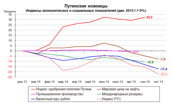 Практически все значимые индикаторы, традиционно характеризующие экономическое благополучие страны, устойчиво идут вниз. По сравнению с декабрем 2013 г. промышленное производство сократилось на 0,7% (по сравнению с апрелем – на 1,5%), инвестиции – на 2,2%, грузооборот транспорта – на 2,9%, цена на нефть («Брент») – на 7,9% (по сравнению с июнем – на 14,3%), международные резервы России – на 10,9% (по сравнению с январем 2013 г. – на 15,5%), курс рубля к доллару – на 17,4%, индекс фондового рынка РТС – на 22,2%.