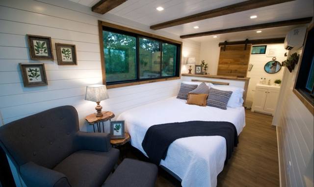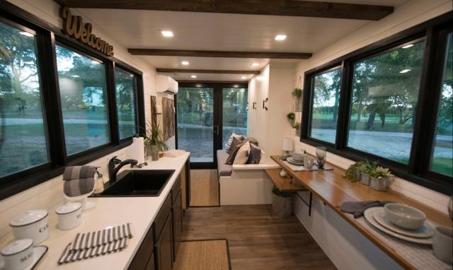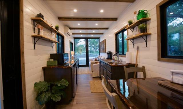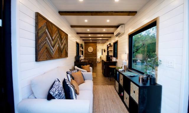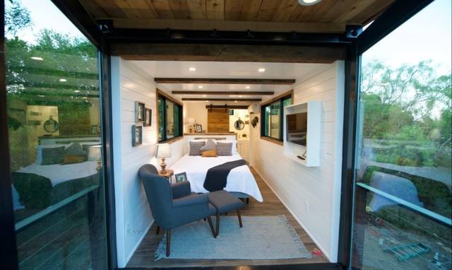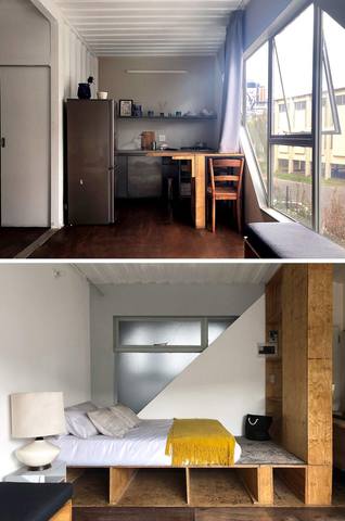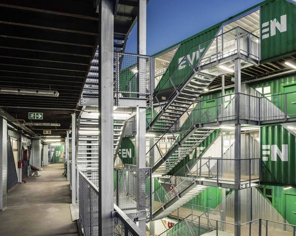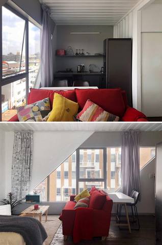 В каждой из них есть жилые комнаты – столовая, гостиная и спальня, а также кухня и санузел. Потолком в квартирах служит металлический сайдинг контейнера, который придает пространству ощущение промышленности. Регенерированные деревянные полы и чистые белые стены создают атмосферу свежести и уюта. В центре внутреннего двора расположена общественная зона с садом и открытым бассейном.