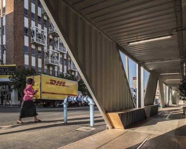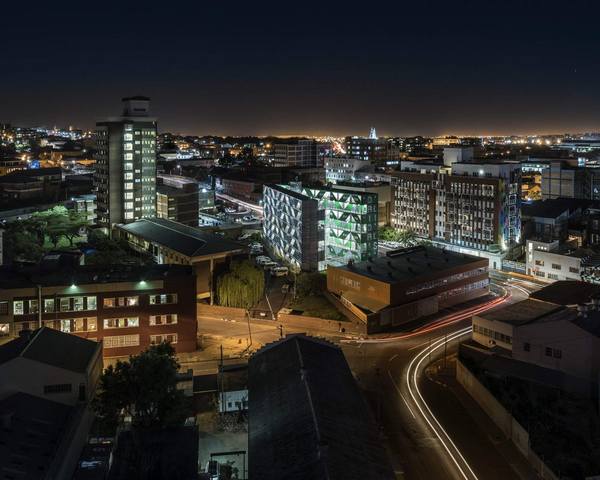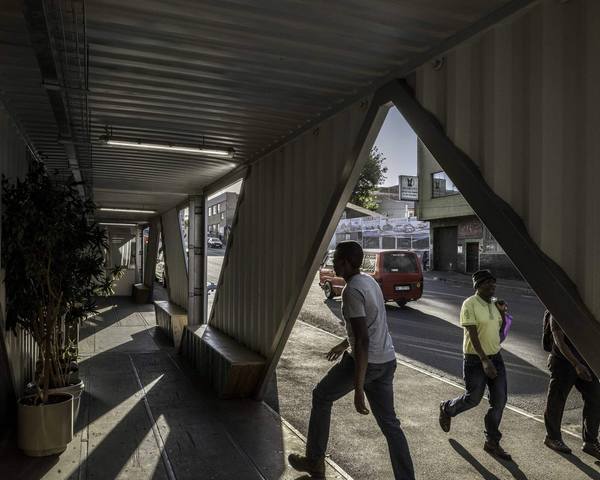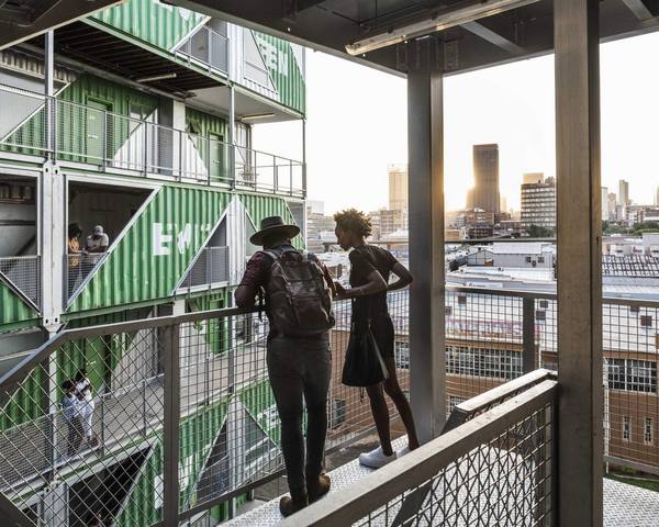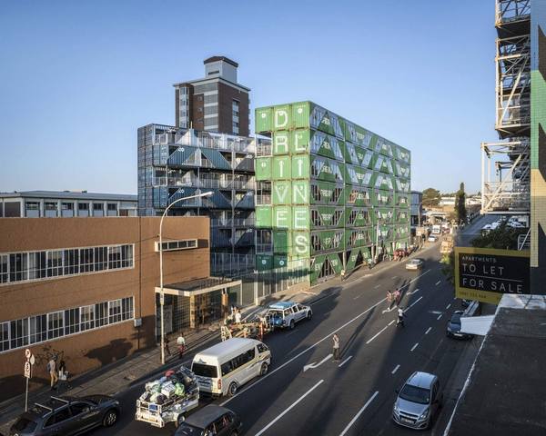 Проект нестандартного жилого комплекса Drivelines Studios разработан итальяно-американской архитектурной студией LOT-EK и реализован в 2017 году в деловом центре Мабоненг города Йоханнесбург, Южная Африка. Семиэтажный дом площадью 6968 квадратных метров построен из 140 старых морских контейнеров и представляет собой два отдельных объема, состоящих из поставленных друг на друга одинаковых контейнеров. Дом возведен на неудобном треугольном участке земли и имеет форму буквы V. Одна секция дома была собрана из синих контейнеров, другая – из зеленых. Блоки-контейнеры прочно скреплены между собой, обеспечены современной теплоизоляцией и по мере необходимости изменены в соответствии с функциональным назначением помещений.