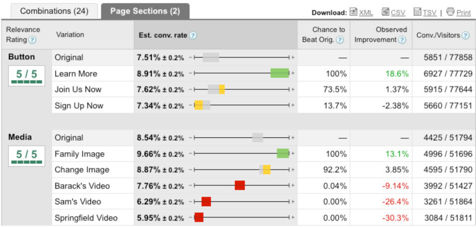 Для эксперимента мы использовали Google Website Optimizer и провели полный факторный многомерный тест. Простыми словами, мы протестировали все комбинации кнопок и медиа-контента. У нас было 4 варианта кнопок, 3 картинки и 3 видеоролика, что означало 24 (4 * 6) комбинации для теста. Каждому посетителю посадочной страницы случайным образом демонстрировалась одна из комбинаций, а мы в свою очередь отслеживали количество посетителей, оставивших свой e-mail.