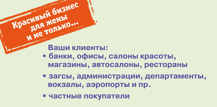 - Корпоративные заказчики: банки, офисы, салоны красоты, магазины, автосалоны, рестораны и пр.; гос. учреждения (загсы, администрации, департаменты, вокзалы, аэропорты и пр.); дизайнеры, организаторы мероприятий, промоутеры.