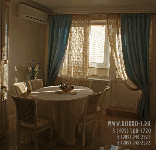Начнем с того, что для начала мы детально изучили интерьерную композицию. И, конечно же, мы сразу обратили внимание, что мебель, скатерть и напольная плитка выполнены в бежевых тонах. К тому же – скатерть и мебельная обивка с оригинальным узором. На основе этого, мы решили применить для украшения световой ниши классические шторы голубого цвета и тюль, с таким же узором, что и на деталях интерьера. Причем, гардины мы сделали и полупрозрачного шелка, так, что при дневном свете сквозь них проглядывает узор на тюле. Очевидно, что это решение не самое стандартное, но зато, насколько эффектное! На фотографиях Вы можете это оценить. Также на фото отлично видно, гармоничны классические шторы, бежевый толь и остальные детали интерьера. Можно даже сказать, что все предметы в комнате идеально сочетаются.
