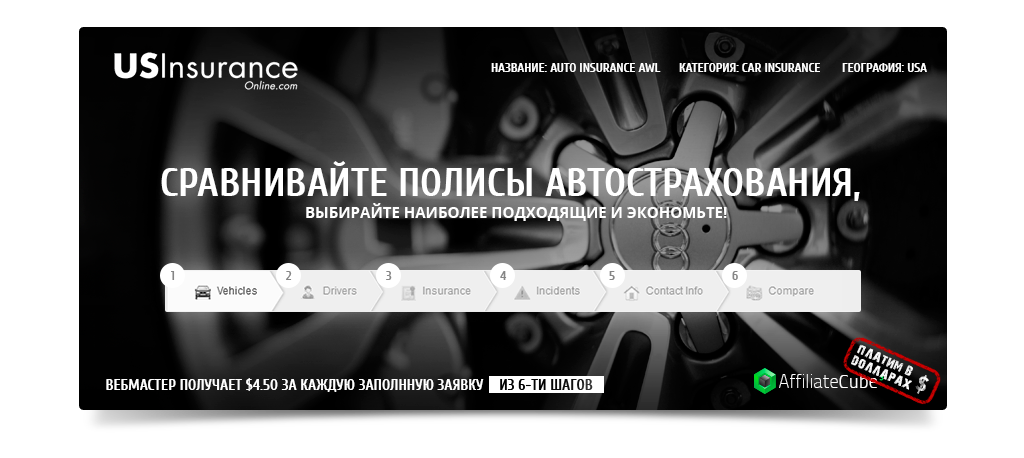 - Партнерская программа по автострахованию $4.5 за заявку и другое