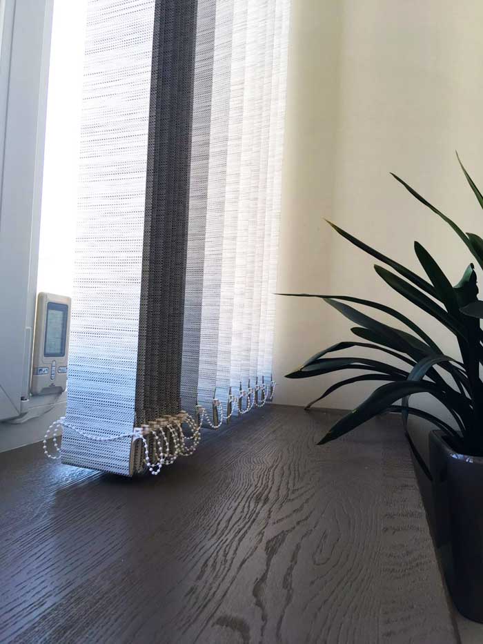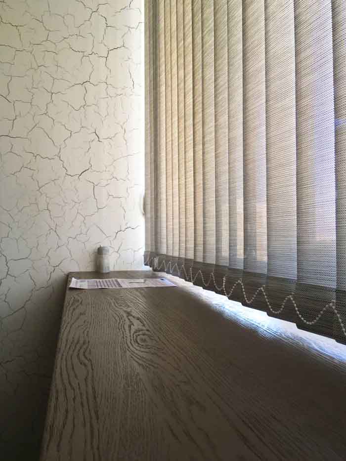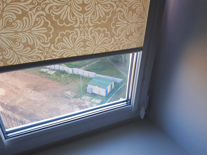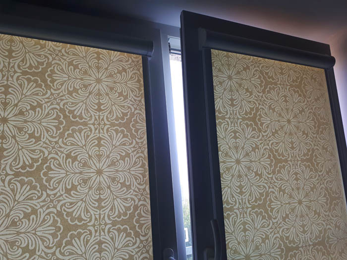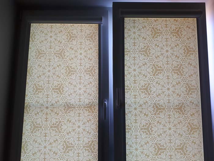 Рулонные шторы устанавливаются на пластиковое окно, а точнее непосредственно на створки. Крепеж – скрытые саморезы. Глубина штапика значения не имеет, что выгодно отличает эту систему от системы Уни-1. По бокам окна фиксируются 2 П-образные направляющие, которые держат ткань при отклонении створки и обеспечивают ее плотное прилегание к стеклу. Система управления – барабанный механизм с пластиковой регулировочной цепочкой. В данном случае у каждой рулонной шторы собственная система управления, поэтому уровень освещенности можно выставить с высокой точностью. Цвет ткани – светло-бежевый, с оригинальным рисунком. Плотность – средняя. Ткань такой плотности полного затемнения не даст, а вот мягкое рассеивание света на лицо. Отметим, что рулонные шторы Уни-2 отличаются высокой компактностью, так как ткань сматывается в небольшой рулон, который закрыт декоративно-защитным кожухом. Выцветания ткани практически не происходит, поскольку в процессе изготовления ее волокна пропитывают специальным составом, который снижает воздействие ультрафиолета.